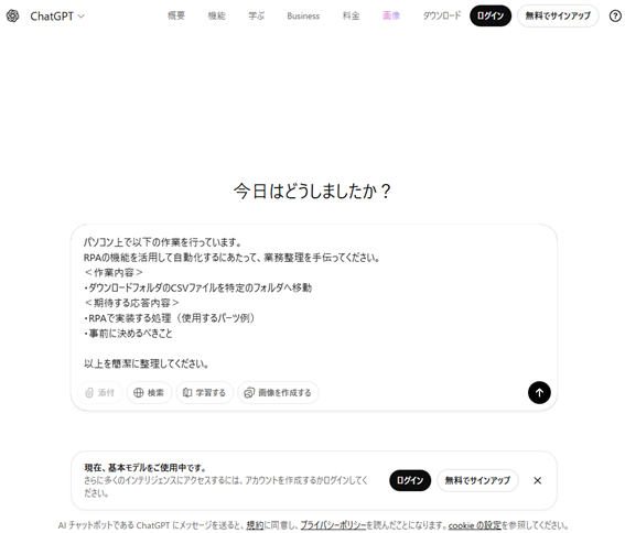 以下に、RPAの業務整理を考えてもらう用途に絞った、サンプルのプロンプトと応答を掲載します。