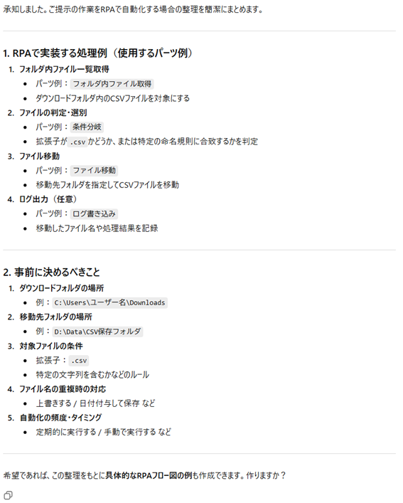 (プロンプト内に、使っているRPAの情報も記載すれば、可能な範囲で対応してくれます)